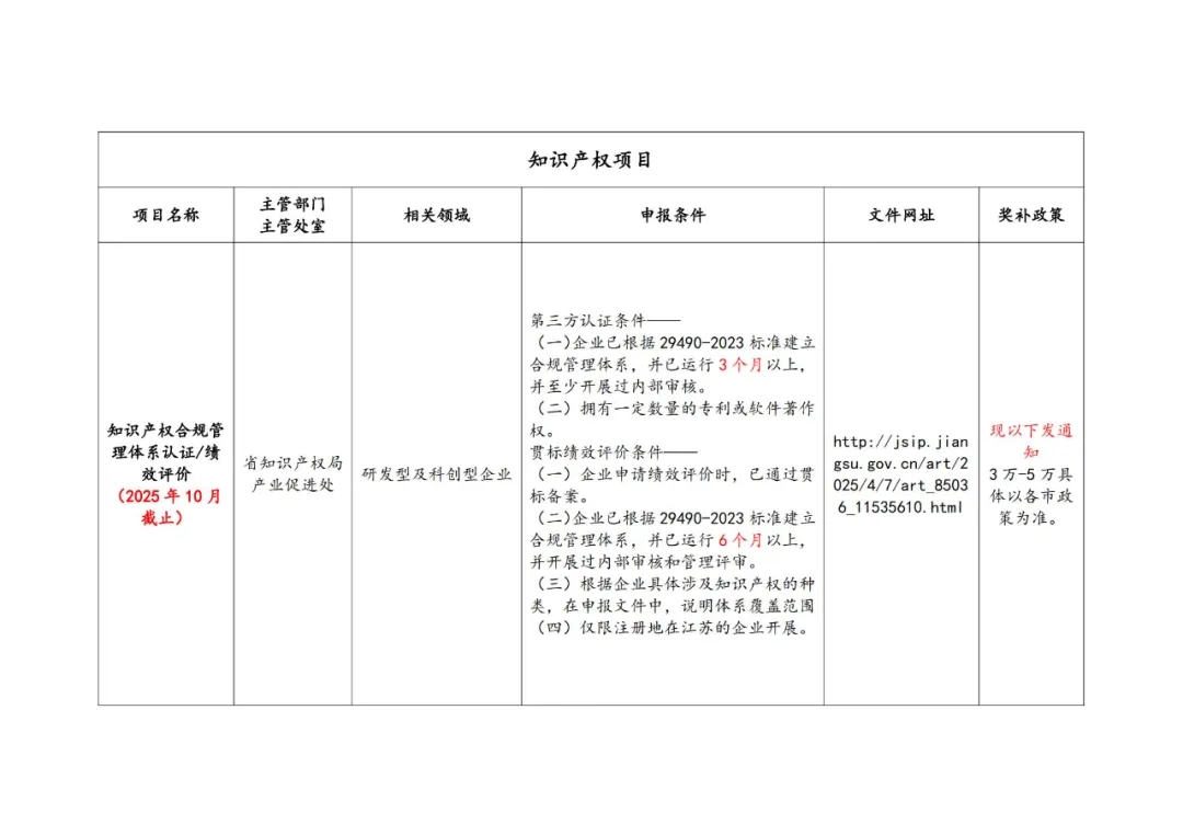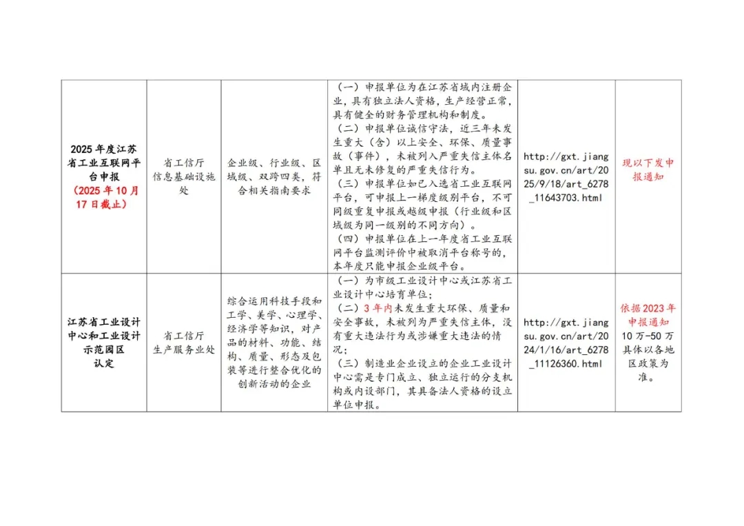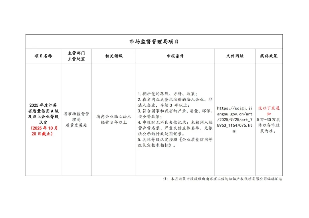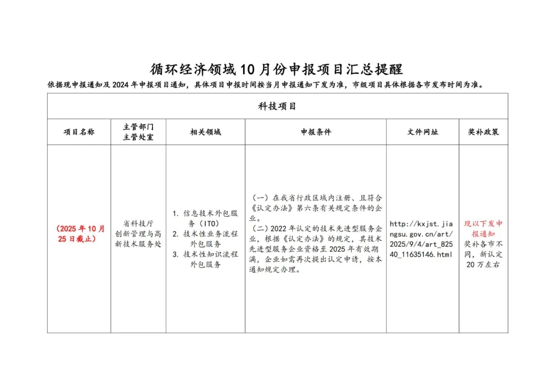 月度政策汇总是江苏省循环经济协会原创栏目,目的是为了更好服务广大会员单位。10月申报项目包括2025年度技术先进型服务企业、江苏省省级企业技术中心、2025年度江苏省工业互联网平台、江苏省工业设计中心和工业设计示范园区认定、国家重点研发计划“长江黄河等重点 流域水资源与水环境综合治理”重点专项、知识产权合规管理体系认证/绩效评价、国家知识产权示范企业、2025年度江苏省质量信用A级及以上企业等级认定等。重要政策不错过,一起来看吧!
