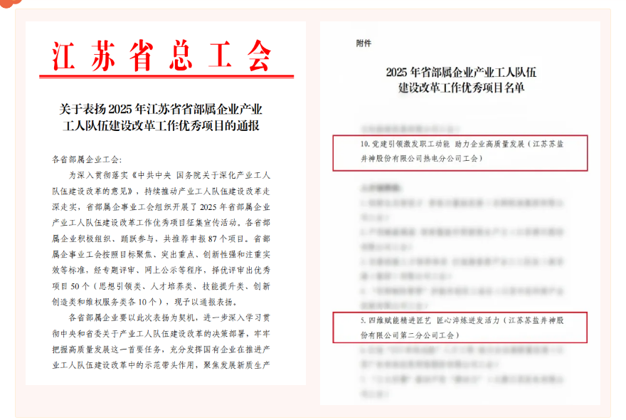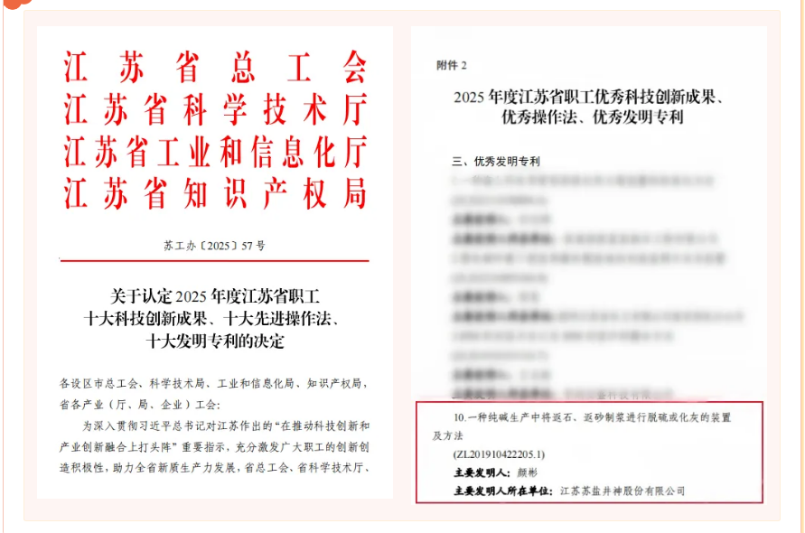近日,江苏省总工会联合省科技厅、工信厅、知识产权局共同发布2025年度江苏省职工十大科技创新成果、十大先进操作法、十大发明专利认定名单,苏盐井神公司颜彬等发明的“一种纯碱生产中将返石、返砂制浆进行脱硫或化灰的装置及办法”获评优秀发明专利。江苏省省部属企事业工会通报表扬2025年省部属企业产业工人队伍建设改革工作优秀项目,苏盐井神二分公司《四维赋能精进匠艺 匠心淬炼迸发活力》、苏盐井神热电分公司《党建引领激发职工动能 助力企业高质量发展》2个项目名列其中。