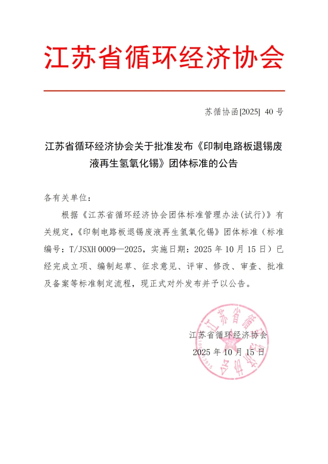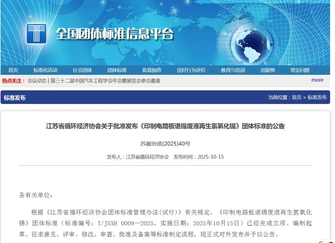 近日,由江苏省循环经济协会联合多家环保科技企业、高校及研究机构共同起草的《印制电路板退锡废液再生氢氧化锡》团体标准(T/JSXH 0009—2025)已通过全国团体标准信息平台审核对外公布(公告网址https://www.ttbz.org.cn/Home/WebDetail/109071),并于2025年10月15日正式发布实施。