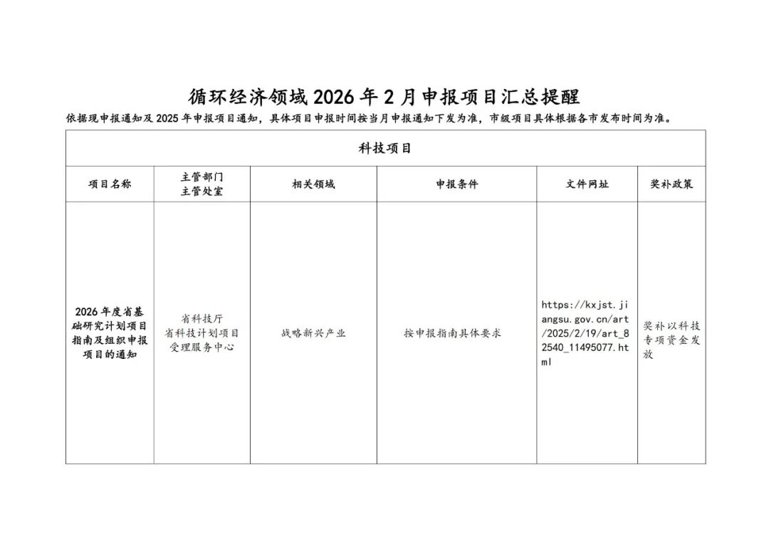 月度政策汇总是江苏省循环经济协会原创栏目,目的是为了更好服务广大会员单位。2026年2月申报项目包括年度省基础研究计划项目指南及组织申报项目的通知、年度省重大创新平台计划项目的通知、年度省碳达峰碳中和科技创新专项资金项目指南及组织申报项目的通知、年度省前沿技术研发计划(社会发展领域)项目指南及组织申报项目的通知、年度江苏省制造强省建设专项资金项目申报的通知等。重要政策不错过,一起来看吧!